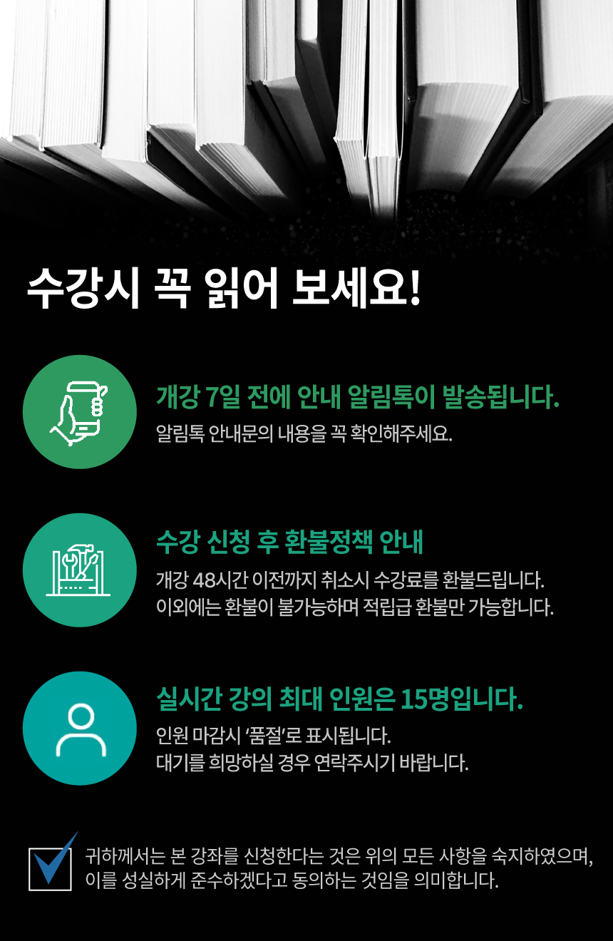 - 그 이후 취소는 환불은 불가능하며 다음 수업으로 연기 혹은 다른 수업으로 대체 가능합니다.